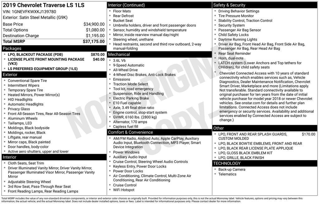 4D Sport Utility 2019 Chevrolet Traverse LS AWD 3.6L V6 SIDI VVT 9-Speed Automatic